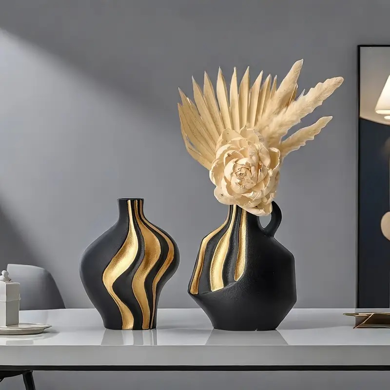 Bohemian Style Ceramic Vase, Geometric Striped Black and Golden Accent, Round Cylinder Shape, Decorative Flower Vase for Living Room, TV Stand, Dining Table, Office Desk Decor, No Power Required