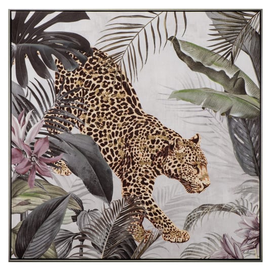A hand finished canvas painting in a stunning wooden frame. Each painting is unique due to its hand-painted finish, giving each painting its own character and visual intrigue. This stunning painting brings the untamed beauty of the jungle into your home with a majestic leopard, captured in a moment of silent grace, prowls through a tapestry of exotic foliage.